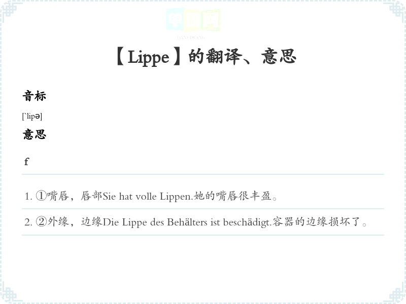 ①嘴唇,唇部Sie hat volle Lippen.她的嘴唇很丰盈。
