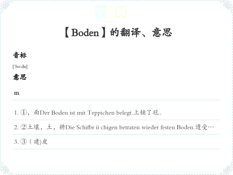 ②土壤,土,耕Die Schifbrüchigen betraten wieder festen Boden.遭受船难者又登上了陆。