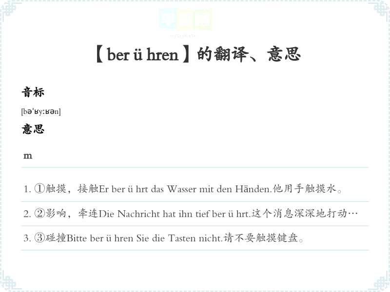 ①触摸,接触Er berührt das Wasser mit den Händen.他用手触摸水。