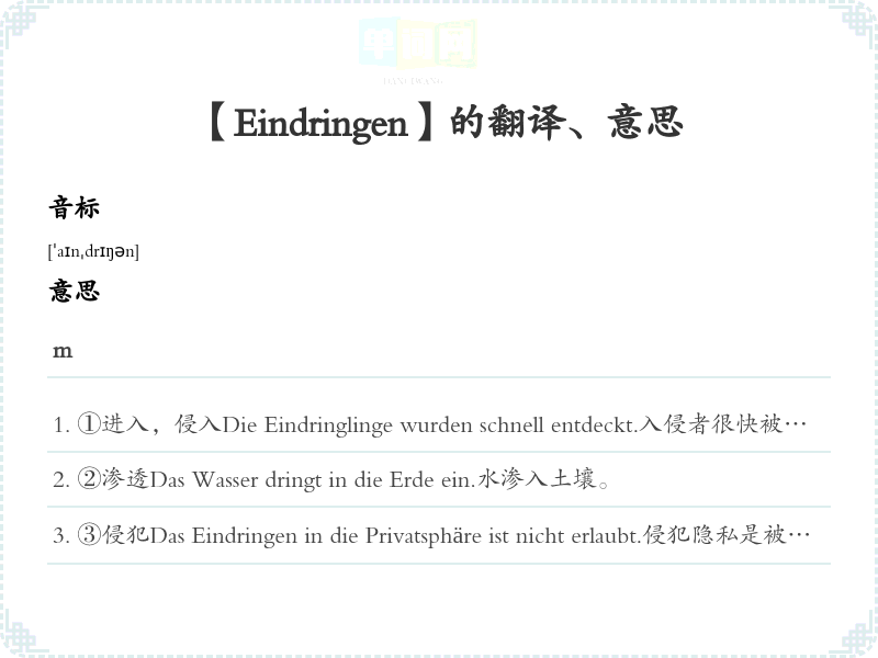 ①进入,侵入Die Eindringlinge wurden schnell entdeckt.入侵者很快被发现。