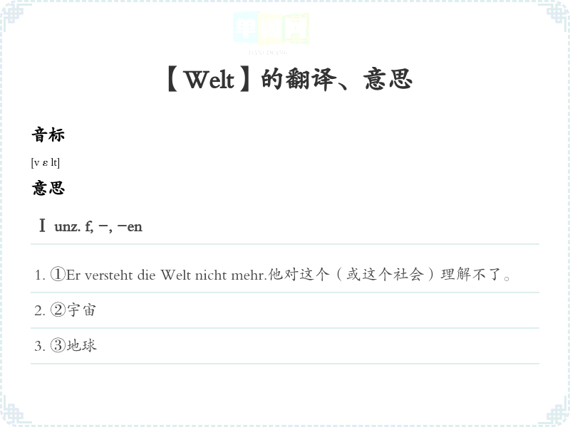 ②,圈子,社会领域,生活范围Seine Welt war die Musik.音乐曾是他的生活内容。