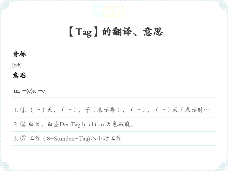① (一)天,(一),子(表示期),(一),(一)天(表示时间,即24小时)Im Laufe des Tages muss ich diese Arbeit erledigen.今天之内我必须完成这项工作。Wir vereinbarten Tag und Stunde unseres Wiedersehens.我们约定了再期和时间。Rom wurde auch nicht an einem Tag erbaut.罗马也非一建成。