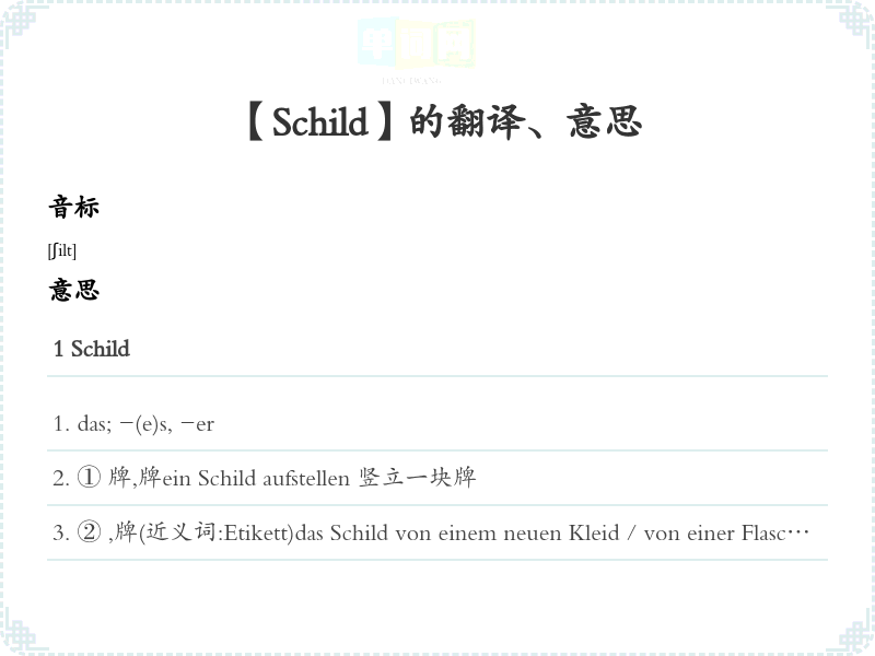 ② ,牌(近义词:Etikett)das Schild von einem neuen Kleid / von einer Flasche entfernen 扯掉新衣服上/瓶上的商2 Schildder; -(e)s, -e