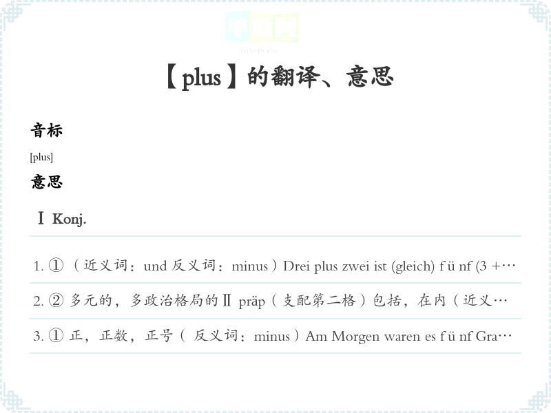 ② 多元的,多政治格局的Ⅱ präp(支配第二格)包括,在内(近义词: zuzüglich 反义词:minus)Die Wohnung kostet 500 DM plus Nebenkosten.这座房子的租金连杂费500马克。Ⅲ adv.