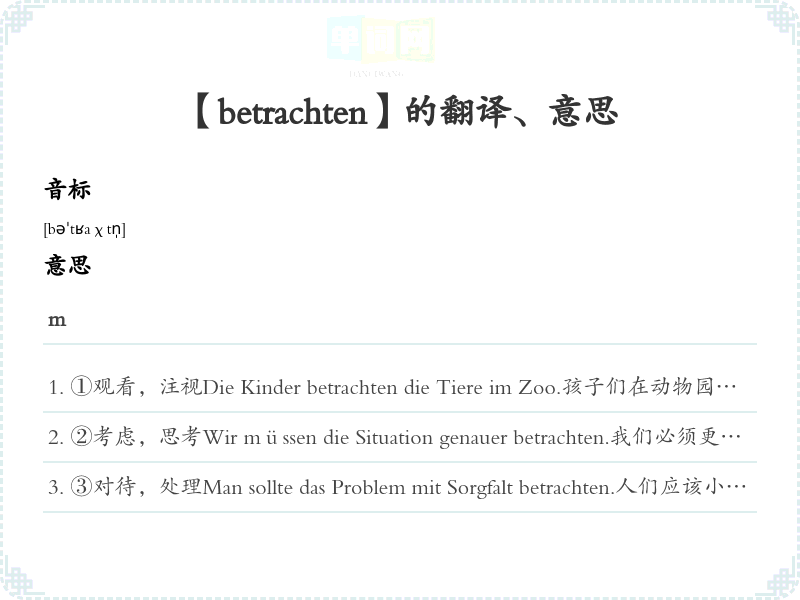 ①观看,注视Die Kinder betrachten die Tiere im Zoo.孩子们在动物园里观察动物。