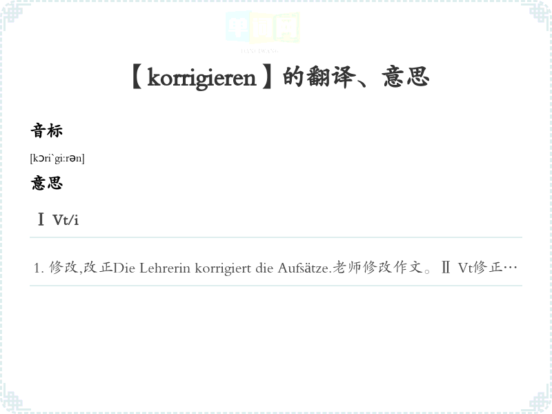 修改,改正Die Lehrerin korrigiert die Aufsätze.老师修改作文。Ⅱ Vt修正,纠正,指正j-s Aussprache, einen Fehler korrigieren 纠正某人的发音,错误语法搭配+四格, sich+四格