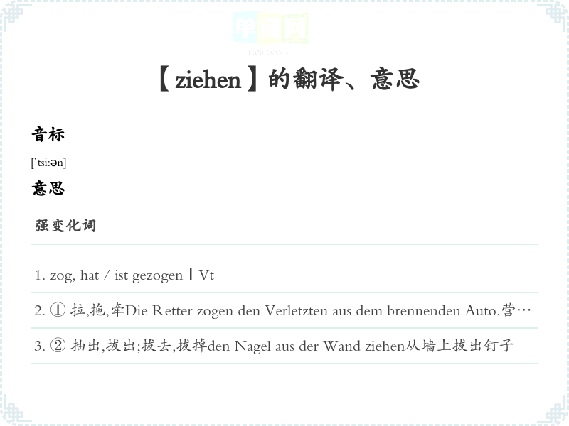 ② 拖延Die Feier hat sich in die Länge gezogen.庆祝会拖得很长语法配+四格, zu+三格, nach+三格, an+三格, aus+三格