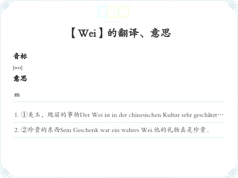 ①美玉,瑰丽的事物Der Wei ist in der chinesischen Kultur sehr geschätzt.瑋在中国文化中备受推崇。