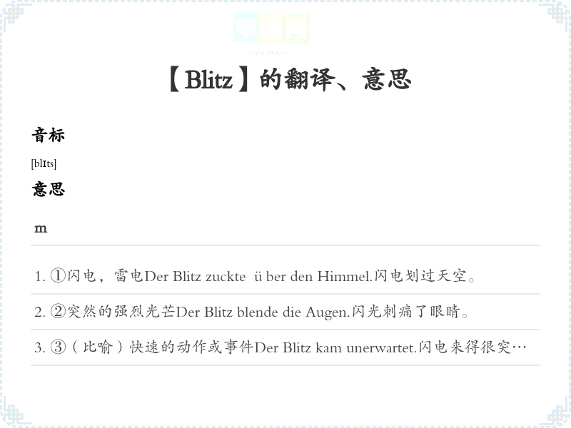 ③(比喻)快速的动作或事件Der Blitz kam unerwartet.闪电来得很突然。