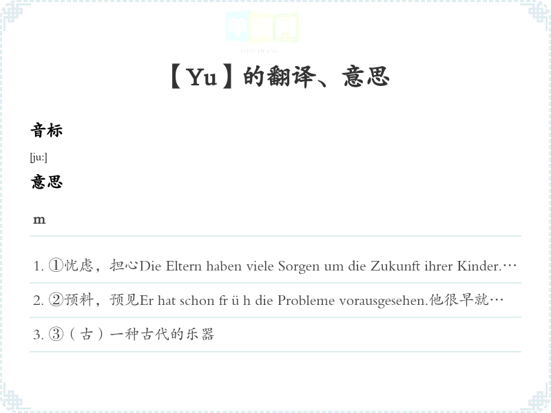 ①忧虑,担心Die Eltern haben viele Sorgen um die Zukunft ihrer Kinder.父母对孩子们的未来有许多担忧。
