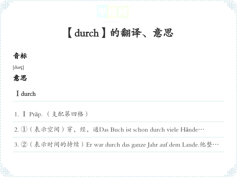 ①(表示空间)穿,经,通Das Buch ist schon durch viele Hände gegangen.这本书已经几易其主了。Der Schuss ging ihm durchs Herz.子弹穿他的心脏。