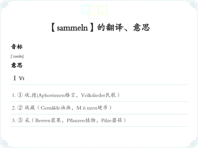 ② 收;收藏Er sammelt schon lange an seinen Briefmarken. 他收邮票已经很久。