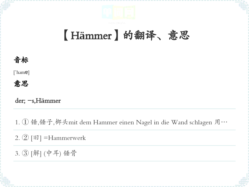 ① 锤,锤子,榔头mit dem Hammer einen Nagel in die Wand schlagen 用锤子把枚钉子钉进墙里etw.(A) unter den Hammer bringen 拍卖某物zwischen Hammer und Amboß geraten 左右为难,敌