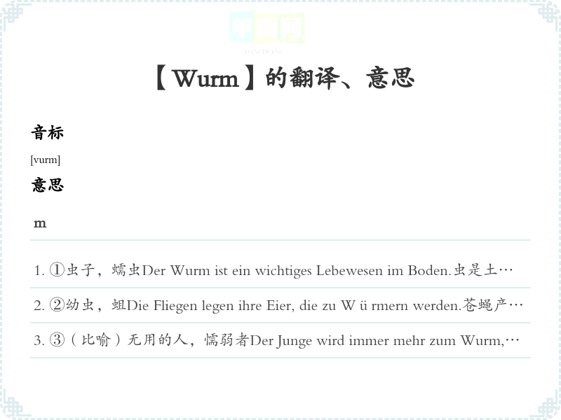 ①虫子,蠕虫Der Wurm ist ein wichtiges Lebewesen im Boden.虫是土壤中重要的生物。