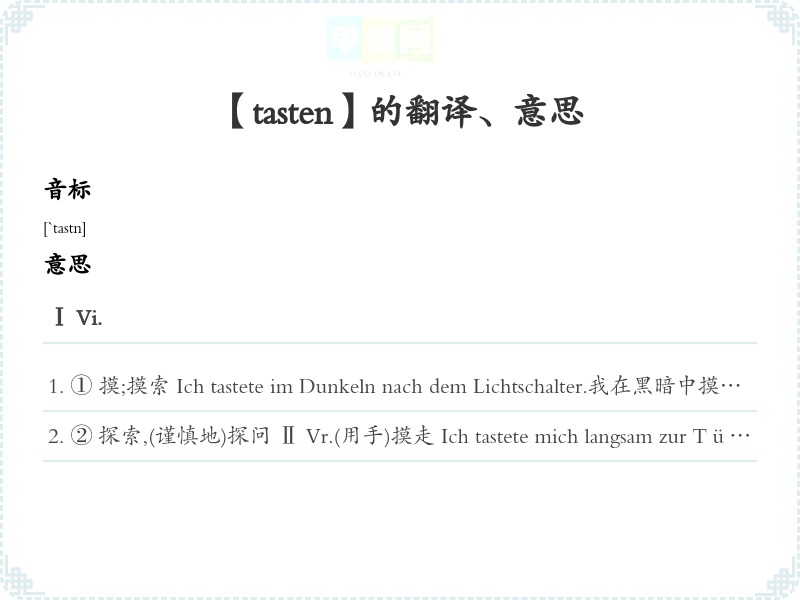 ② 探索,(谨慎地)探问 Ⅱ Vr.(用手)摸走 Ich tastete mich langsam zur Tür.我慢慢摸走向门.Ⅲ Vt.触及,摸语法搭配sich+四格, +四格, nach+三格