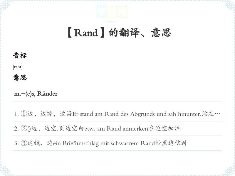 ①边,边缘,边沿Er stand am Rand des Abgrunds und sah hinunter.站在悬崖边往下看。am Rand +二格 stehen处在…边缘jn an den Rand +二格 bringen使某人濒临…[粗] Halt den Rand![粗]安静点!