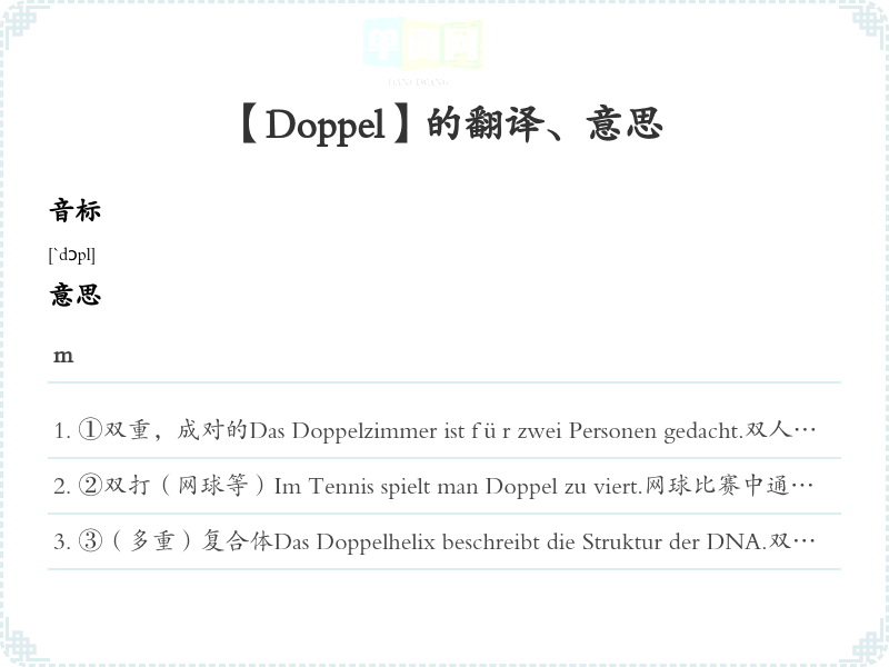 ②双打(网球等)Im Tennis spielt man Doppel zu viert.网球比赛中通常四人进行双打。