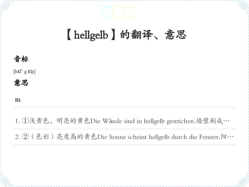 ②(色彩)亮度高的黄色Die Sonne scheint hellgelb durch die Fenster.阳光透过窗户照进来,显得亮黄色。