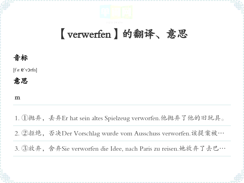 ③放弃,舍弃Sie verworfen die Idee, nach Paris zu reisen.她放弃了去巴黎旅行的想法。