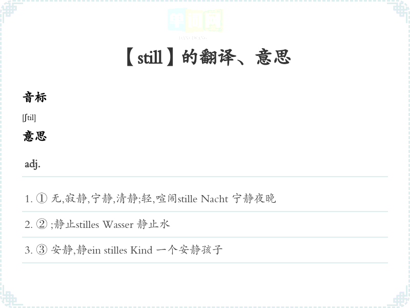 ① 无,寂静,宁静,清静;轻,喧闹stille Nacht 宁静夜晚