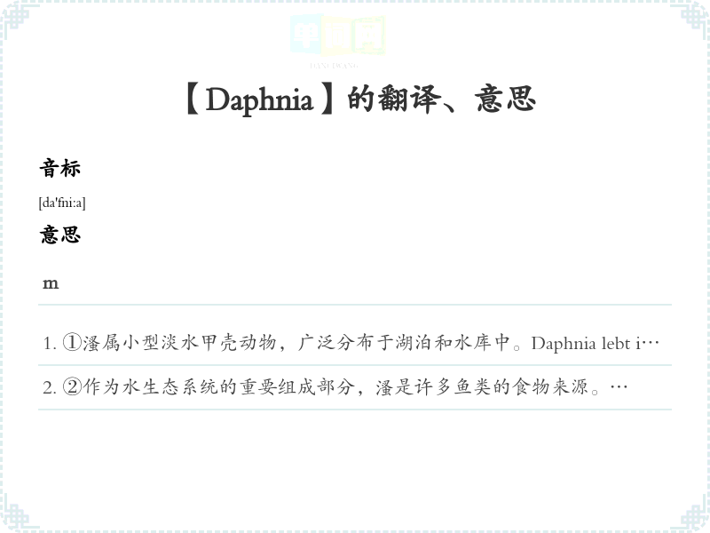 ①溞属小型淡水甲壳动物,广泛分布于湖泊和水库中。Daphnia lebt in vielen Seen und Teichen.溞生于许多湖泊和池塘中。