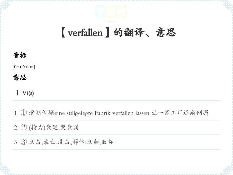 ⑤ (突然)陷入,无意间露出Vor Aufregung verfiel er mitten in der Rede in seinen Dialekt.由于过于激动他在说话中露出了方言。