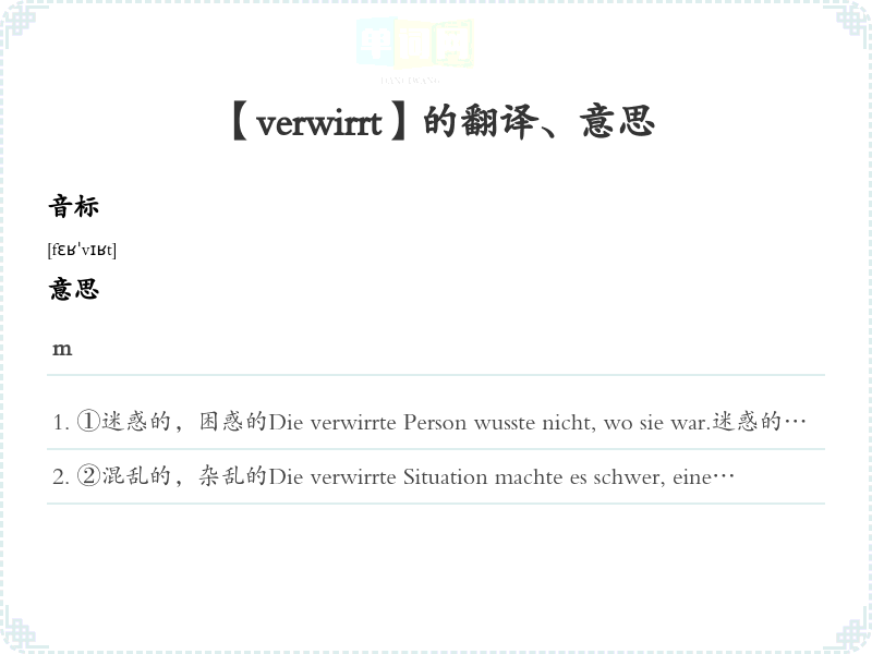 ①迷惑的,困惑的Die verwirrte Person wusste nicht, wo sie war.迷惑的人不知道自己在哪里。