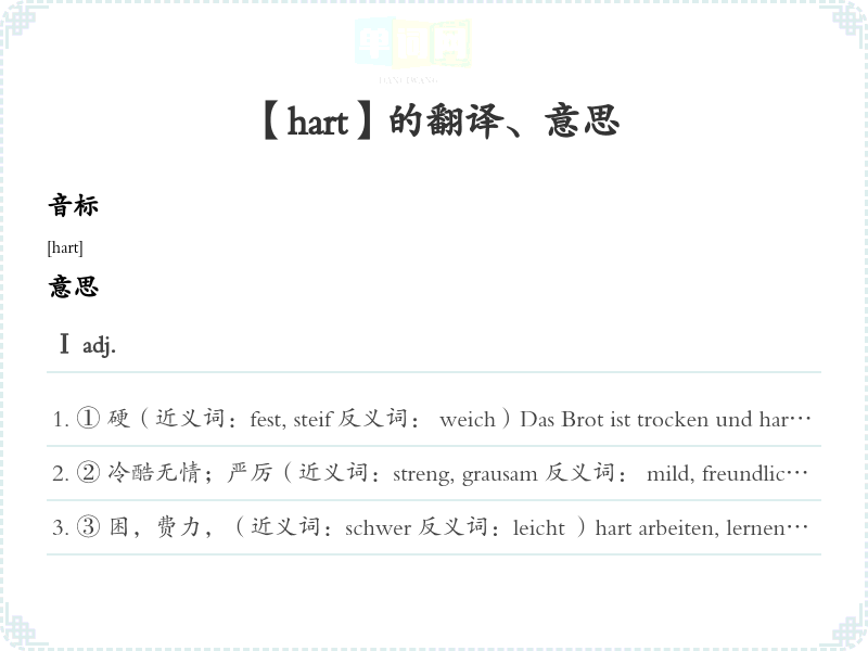① 硬(近义词:fest, steif 反义词: weich)Das Brot ist trocken und hart.面包又干又硬。Die Erde ist so ausgetrocknet, dass sie ganz hart ist.土地由于干涸而变硬了。