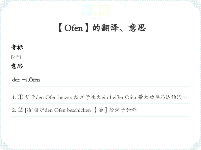 ① 炉子den Ofen heizen 给炉子生火ein heißer Ofen 带大功率马达的汽车/摩托车Jetzt ist der Ofen aus. [口]这下完蛋了。