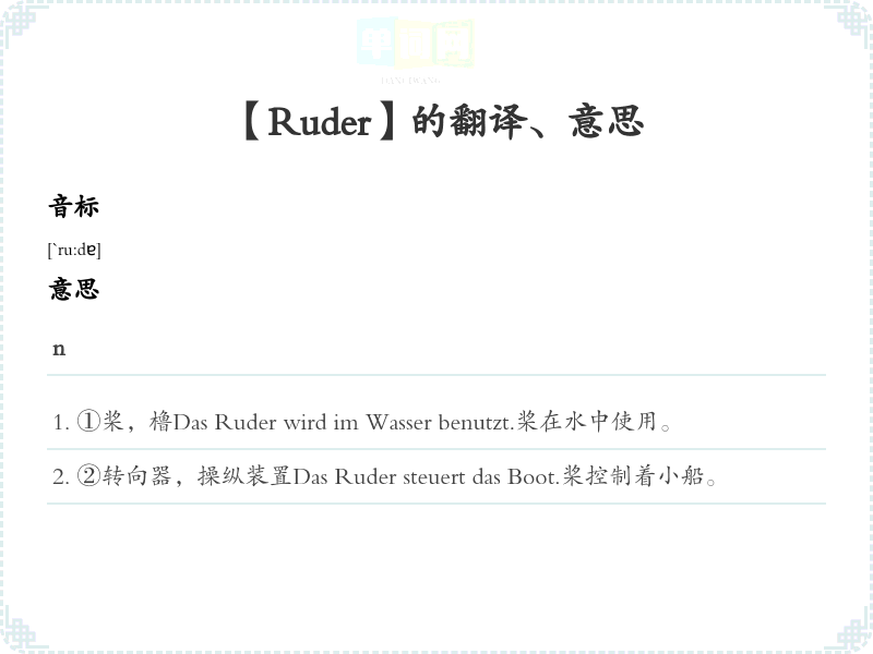 ①桨,橹Das Ruder wird im Wasser benutzt.桨在水中使用。