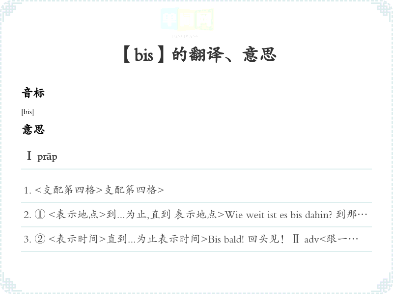② <表示时间>直到...为止表示时间>Bis bald! 回头见!Ⅱ adv<跟一定的介词连用> 跟一定的介词连用>Das Wasser reicht bis an die Knie. 水深到膝盖。Der Ball ist bis aufs Dach geflogen. 球一直飞到屋顶上。Ⅲ konj
