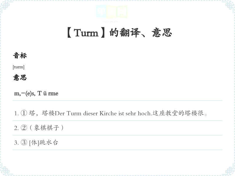 ① 塔,塔楼Der Turm dieser Kirche ist sehr hoch.这座教堂的塔楼很。