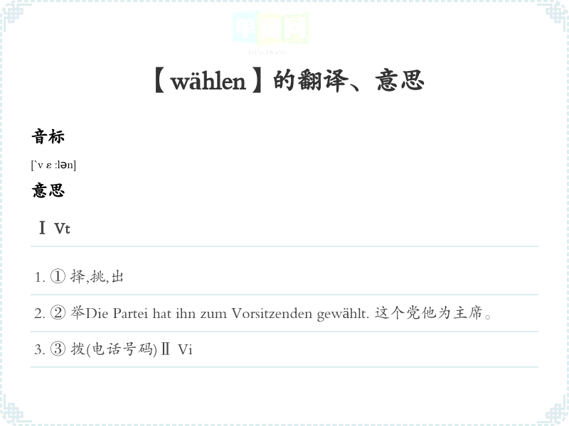 ① 择,挑,定Haben Sie schon gewählt? 您点餐了吗?