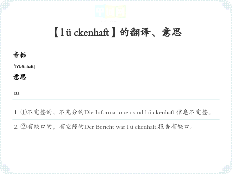 ①不完整的,不充分的Die Informationen sind lückenhaft.信息不完整。
