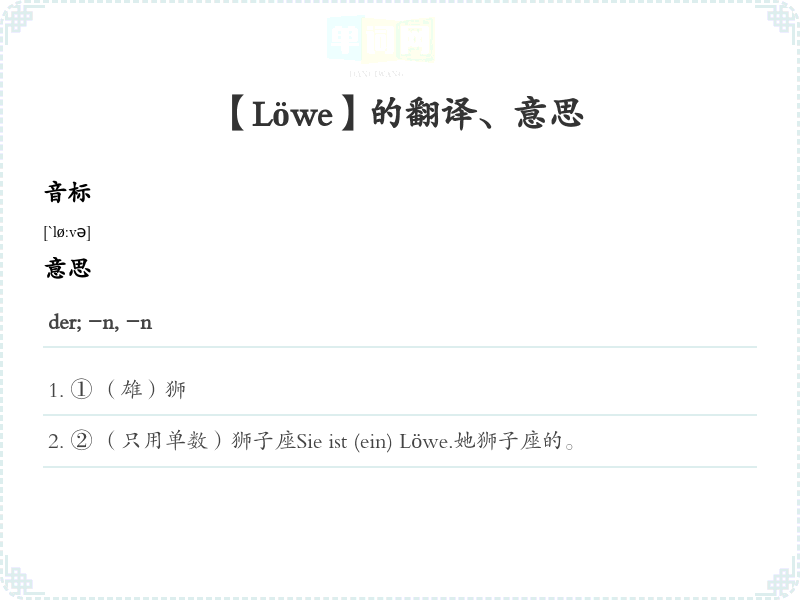 ② (只用单数)狮子座Sie ist (ein) Löwe.她狮子座的。