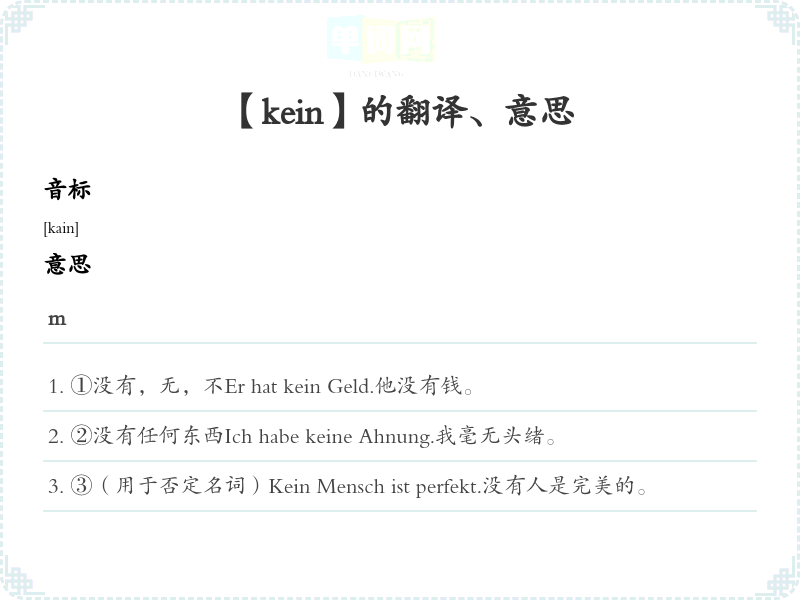 ①没有,无,不Er hat kein Geld.他没有钱。