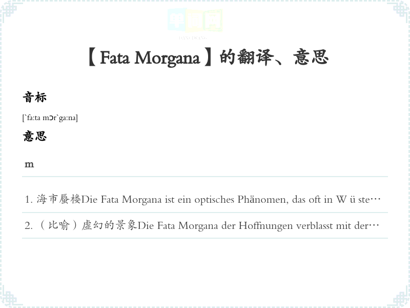(比喻)虚幻的景象Die Fata Morgana der Hoffnungen verblasst mit der Realität.