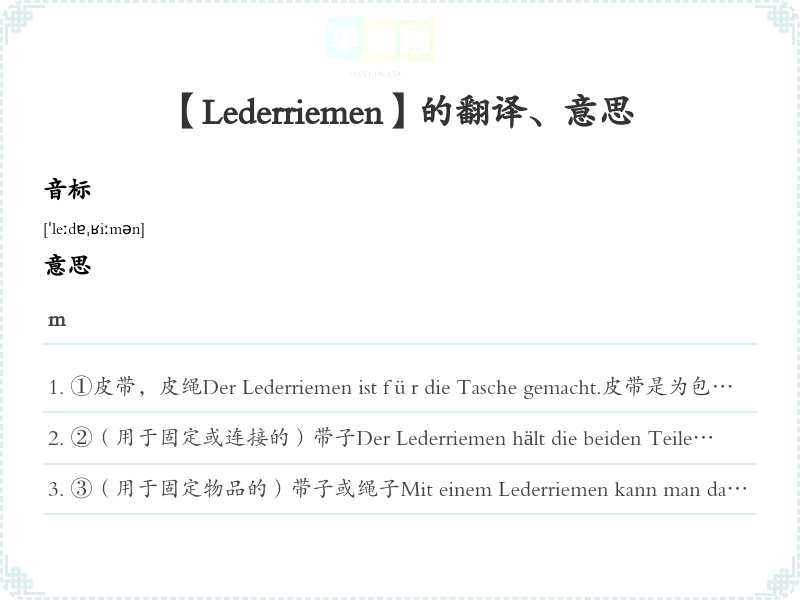 ①皮带,皮绳Der Lederriemen ist für die Tasche gemacht.皮带是为包而做的。