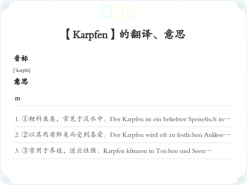 ①鲤科鱼类,常见于淡水中。Der Karpfen ist ein beliebter Speisefisch in vielen Ländern.鲤鱼是许多国家常见的食用鱼。