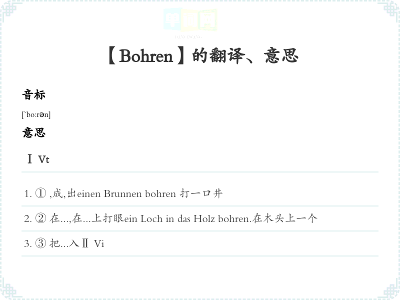 ⑤ 坚持不懈地研究Er bohrte so lange, bis er eine Lösung für dieses Problem fand.他坚持不懈地研究,直到找到了解决这个问题的方法。Ⅲ Vr进,穿入,刺入,深入Der Nagel bohrte sich durch die Sohle.钉子扎进了鞋底。语法搭配sich+四格, +四格, in+三格, in+四格, nach+三格, durch+四格