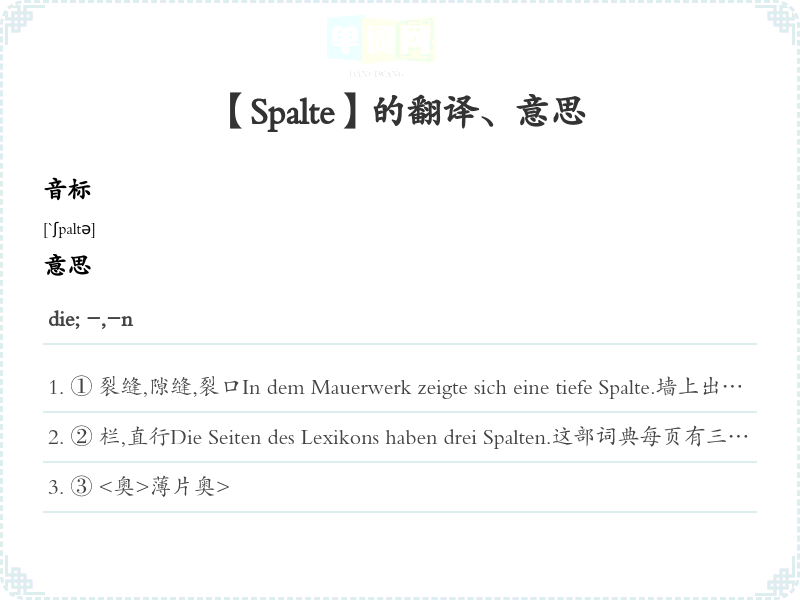 ① 裂缝,隙缝,裂口In dem Mauerwerk zeigte sich eine tiefe Spalte.墙上出现了一条裂缝。