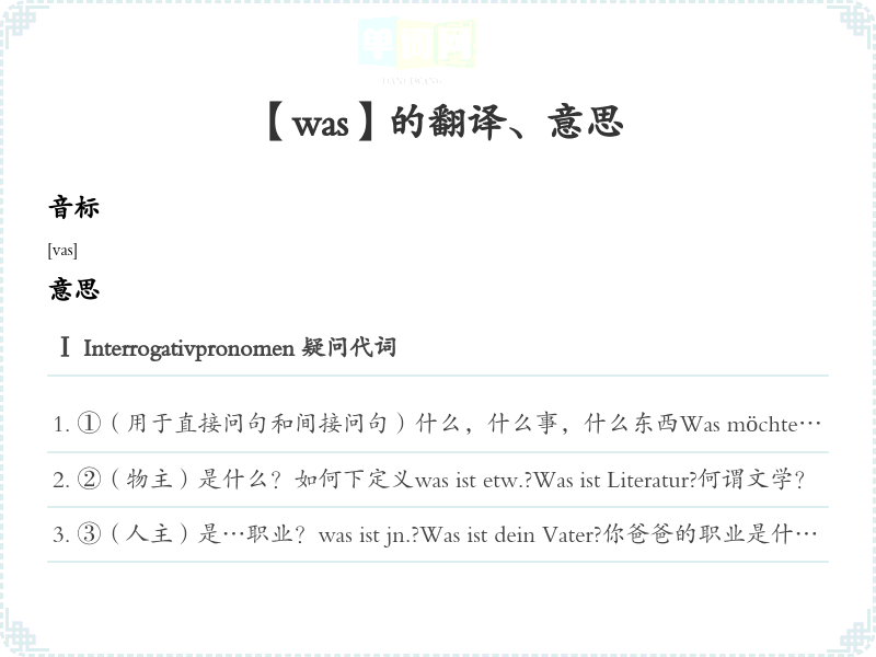 ⑤…样的?Was für ein/eine+ 名词Was für ein Wein möchtest du?你想要什么样的葡萄酒?Ⅱ Interjektion[](表示惊讶)什么!怎么!Was, das weißt du noch nicht?什么,你还不知道啊!ach was!什么糟的,什么呀(意为不信)Ⅲ Relativpronomen(关系代词)