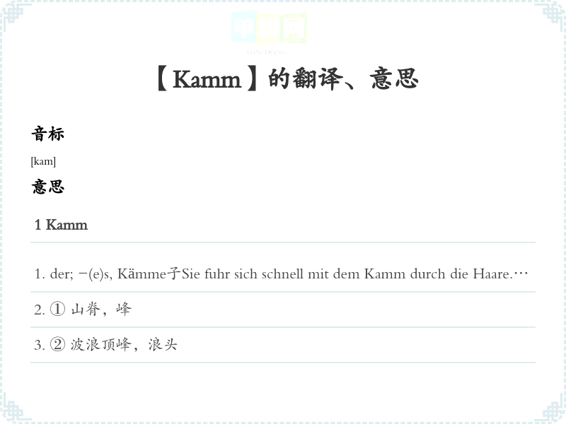 der; -(e)s, Kämme子Sie fuhr sich schnell mit dem Kamm durch die Haare.她很快子了头。2 Kammder; -(e)s, Kämme鸡冠3 Kammder; -(e)s, Kämme