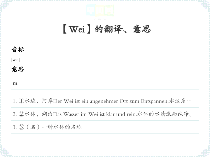 ②水体,湖泊Das Wasser im Wei ist klar und rein.水体的水清澈而纯净。
