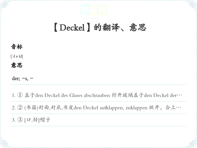 ① 盖子den Deckel des Glases abschrauben 拧开玻璃盖子den Deckel der Truhe zufallen lassen, schließen合上,关上箱盖