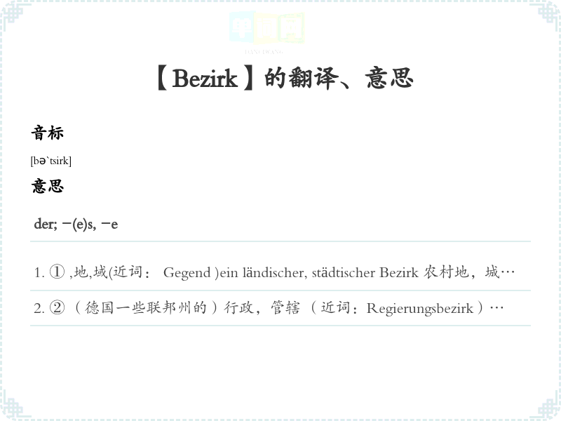 ① ,地,域(近词: Gegend )ein ländischer, städtischer Bezirk 农村地,城市地die Kunden eines Bezirks betreuen 接待(照料)地客户