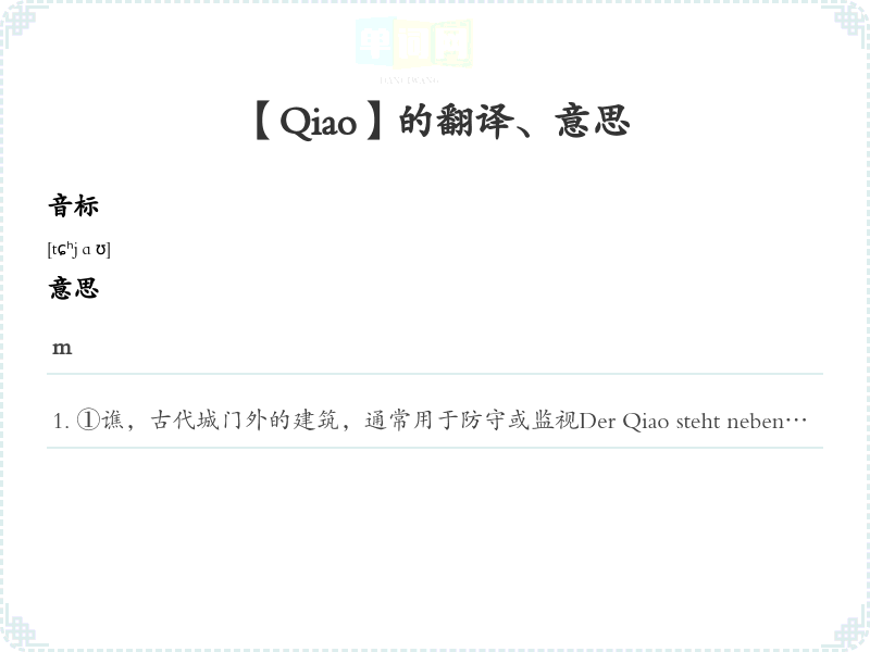 ①谯,古代城门外的建筑,通常用于防守或监视Der Qiao steht neben der Stadtmauer.谯楼位于城墙旁边。