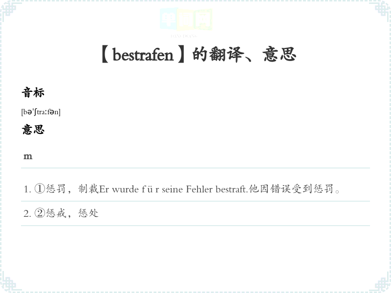 ①惩罚,制裁Er wurde für seine Fehler bestraft.他因错误受到惩罚。
