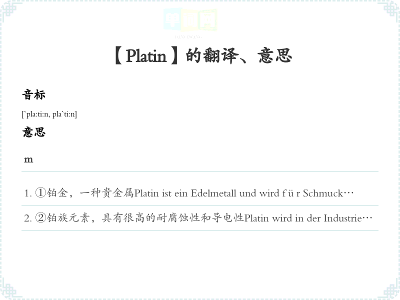①铂金,一种贵金属Platin ist ein Edelmetall und wird für Schmuck verwendet.铂金是一种贵金属,常用于制作首饰。