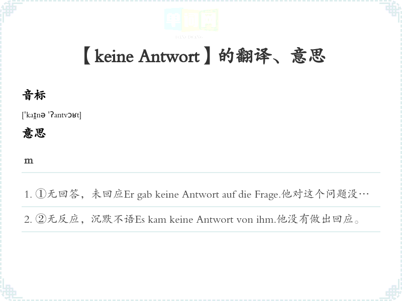 ①无回答,未回应Er gab keine Antwort auf die Frage.他对这个问题没有回答。